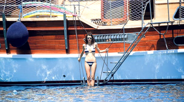 Oyuncu, denize gireceği sırada eşi merdivenlere gelerek, ona öpücük yolladı. Kısa süre konuşan çiftten Saat, suya girerek serinledi. Fit görüntüsüyle dikkat çeken oyuncu, üzerini değiştirdikten sonra ıslak bikinisini tekneye astı.